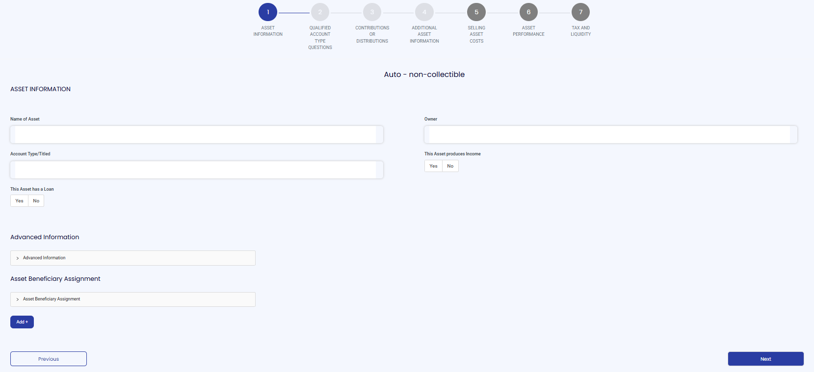 5. A few forms appear with fields relevant to the selected sub-type (e.g., Name, Value, Date Acquired, Notes).