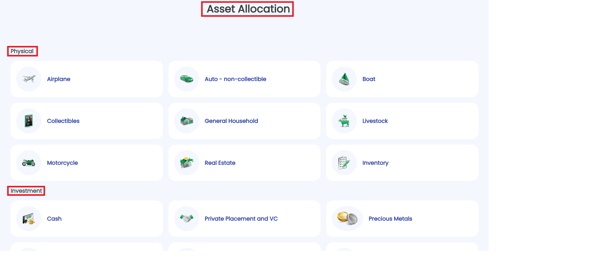 - System displays a list of sub-types grouped under Physical and Investment (e.g., Real Estate, Vehicle under Physical; Stocks, Bonds under Investment).
