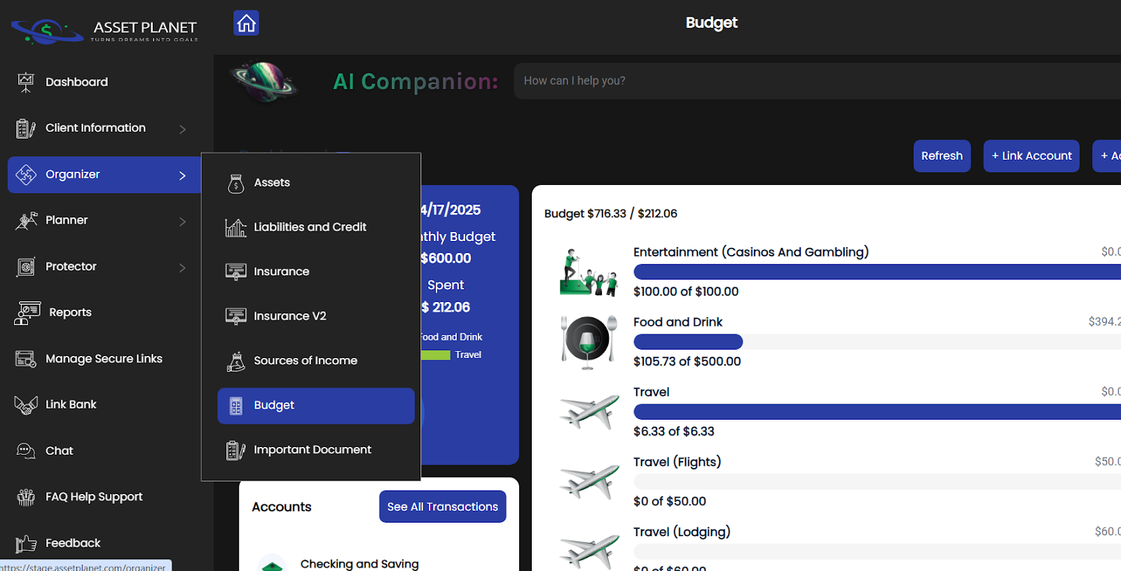 - Account Insights: View spending distribution across various account types, including checking, savings, credit cards, and more.