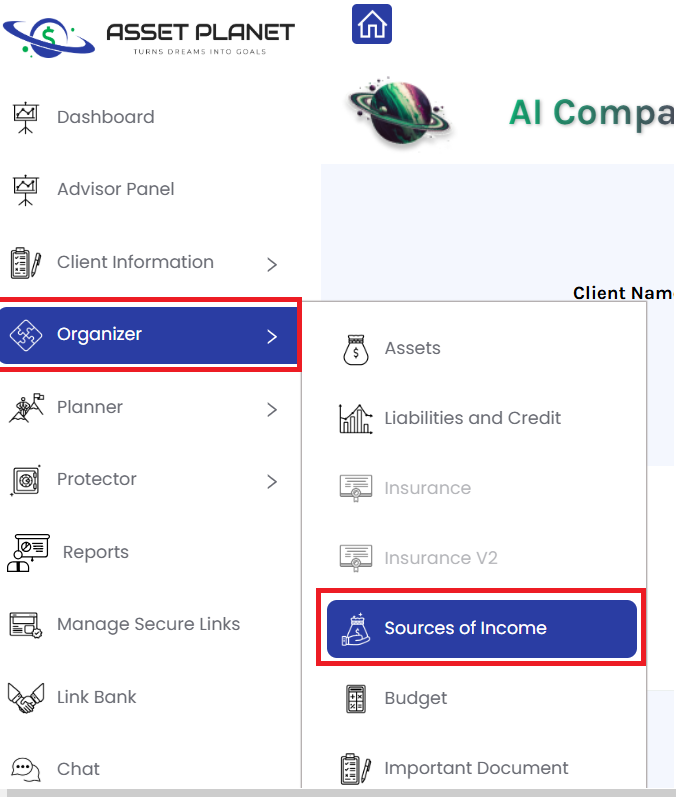 User clicks on the “Source of Income” tab under the “Organizer” menu.