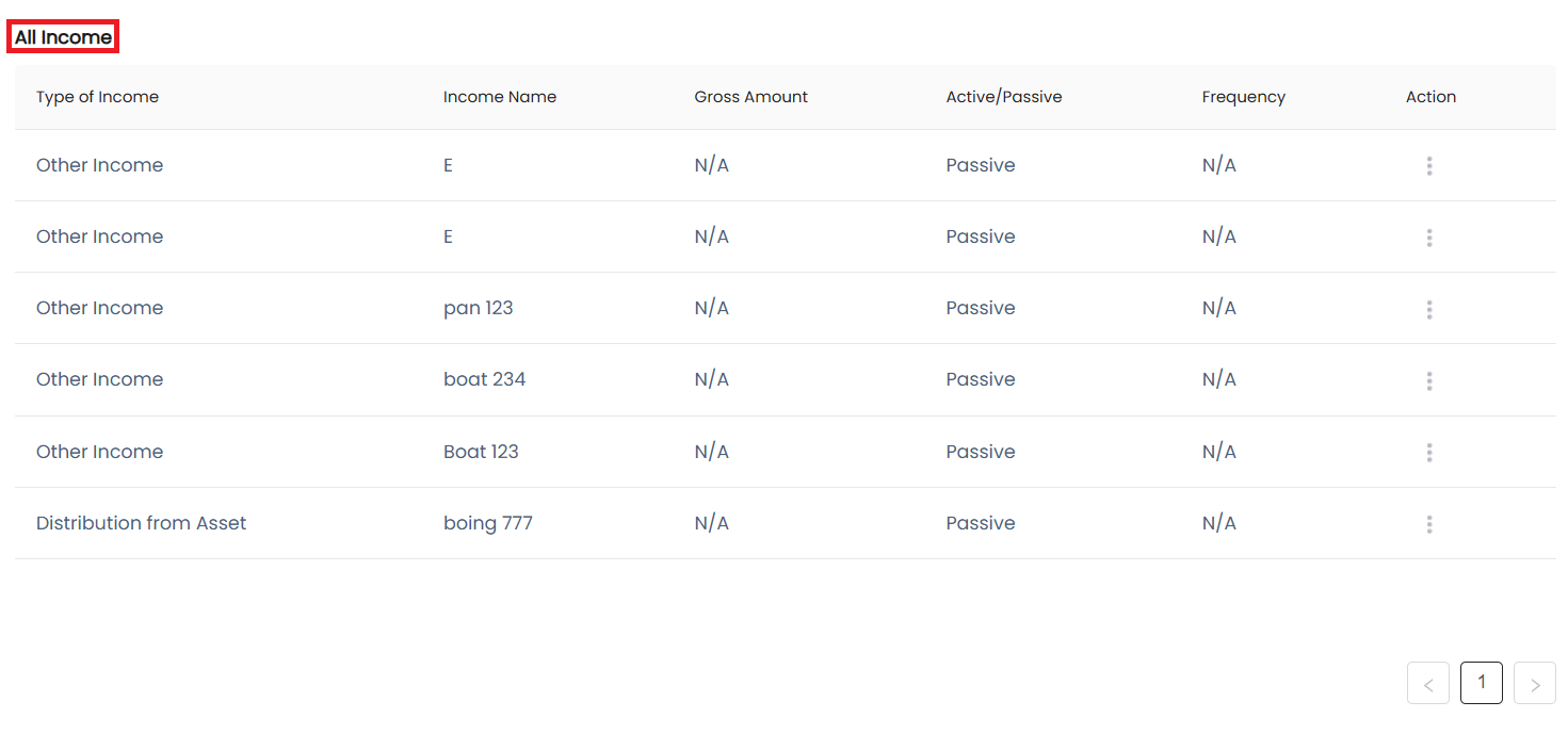 5. User scrolls further to view a table listing all income entries, including details like name, type, amount, frequency, and source.