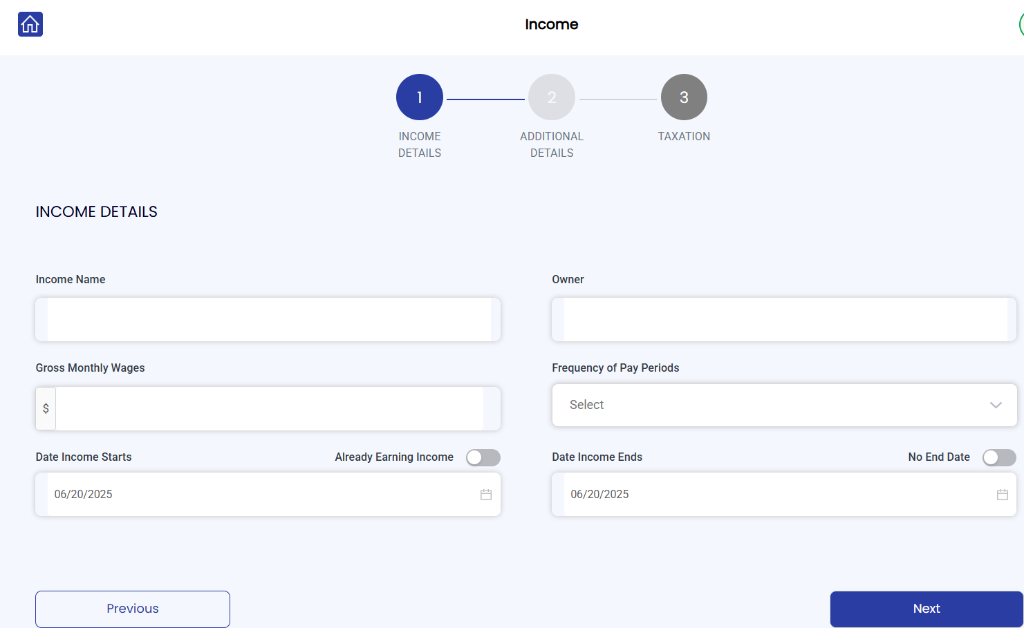 To add a new income entry by selecting its type, sub-type, and sub-sub-type from a single unified interface and entering relevant details.