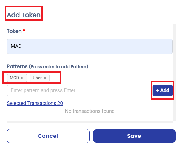 Goal: Allow users to define a token with one or more patterns to identify recurring transactions. The system uses this token to match and tag future (and optionally past) transactions automatically.