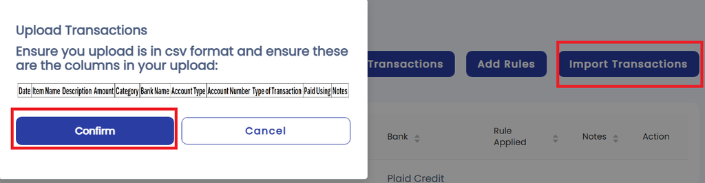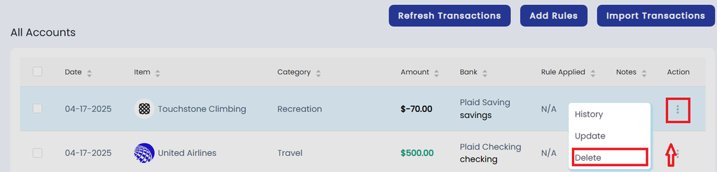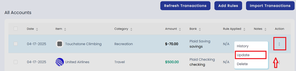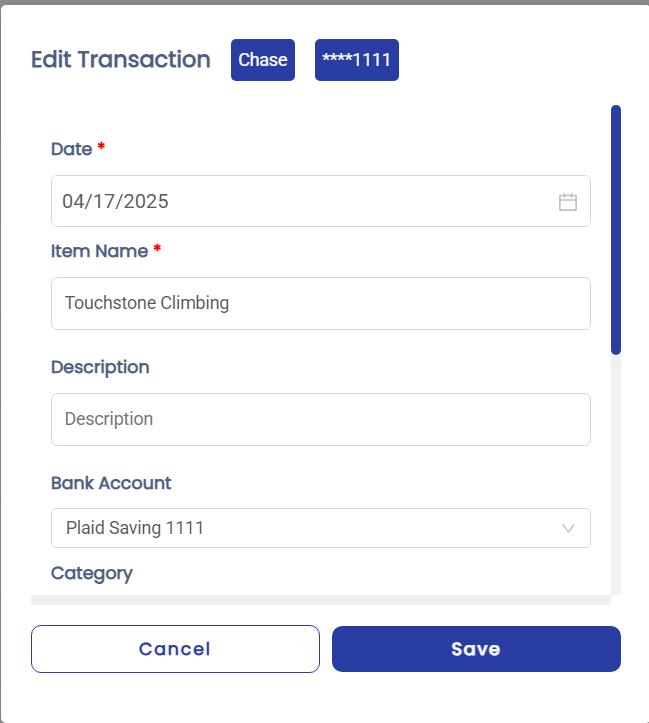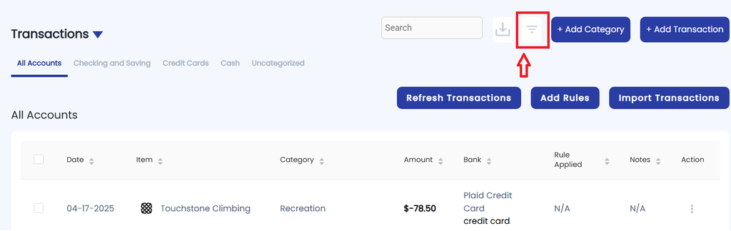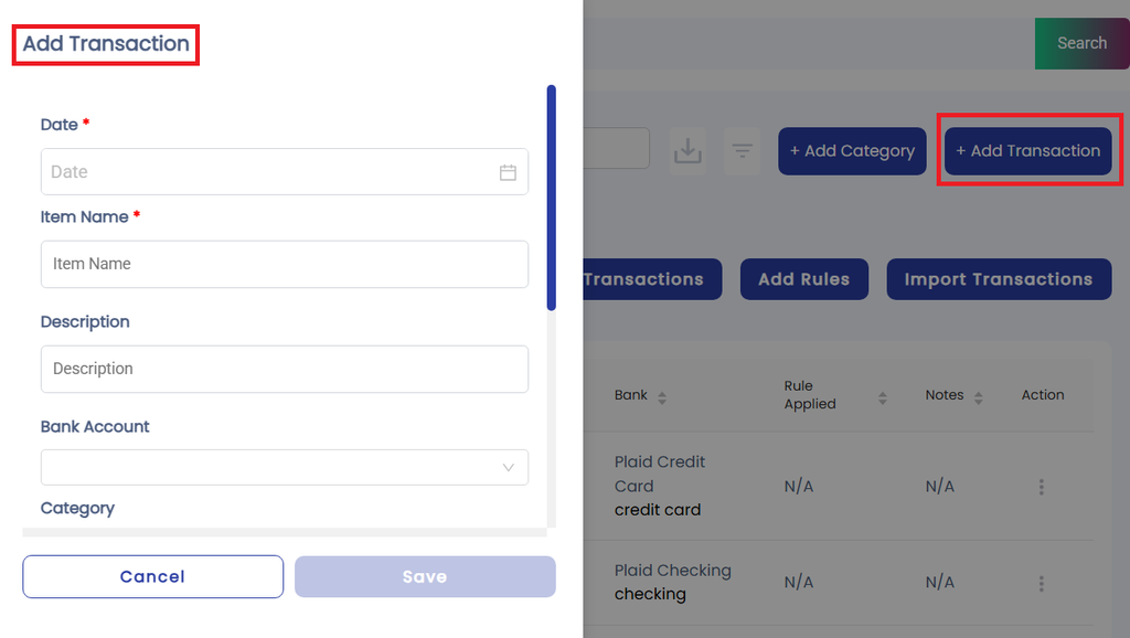 - Transaction Management: Access all your transactions in one place—automatically fetched via Plaid, added manually, or imported in bulk for convenience.