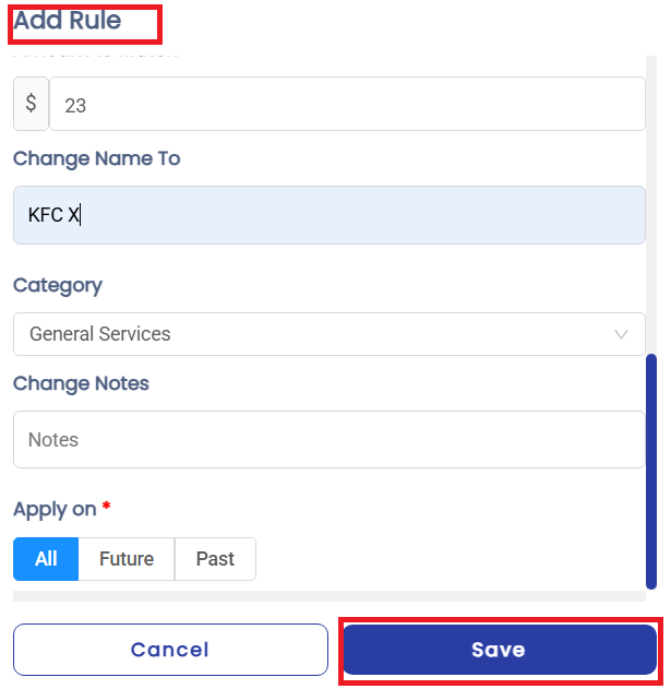 (e.g., “Amazon”, “Uber”) - Amount Condition (Optional):