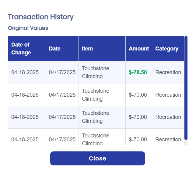 Goal: Allow the user to edit and update the details of a previously recorded transaction.